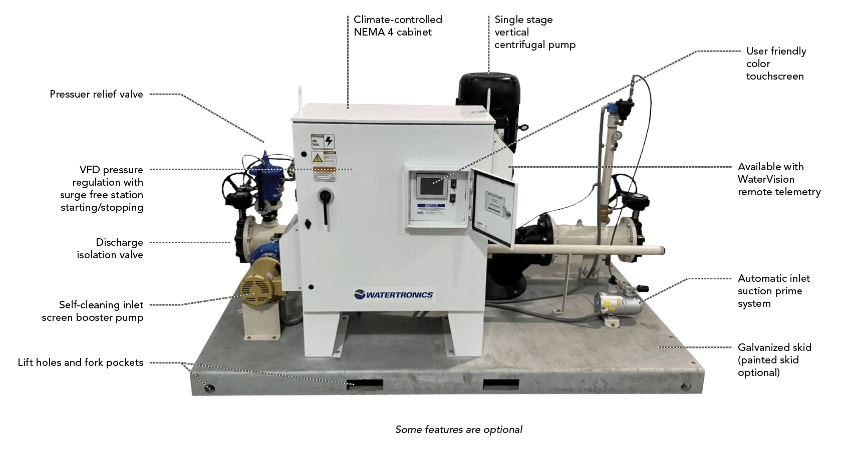 High volume, skid mounted Vertical Centrifugal single stage pump station with simple touchscreen operation can be used for flooded suction, boost and lift applications. Our advanced pump logic uses actual pump curve data to provide intelligent sequencing for optimal wire-to-water efficiency. Engineered for continuous operation in challenging environments, the VC is reliable, rugged, and long-lasting. Your pump station arrives pre-packaged and factory tested, ready for quick installation and start-up.